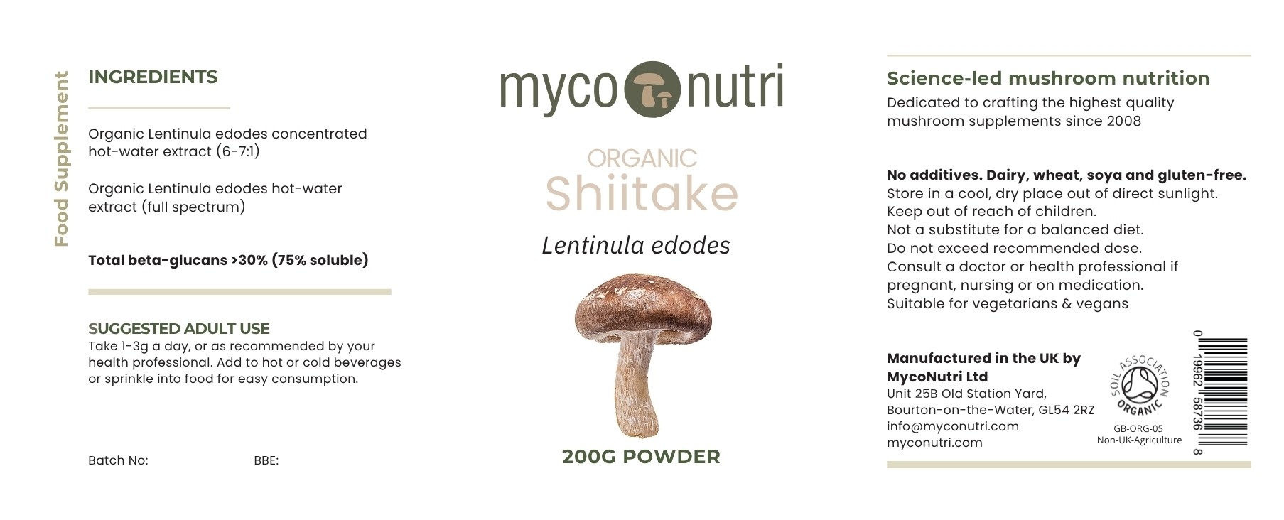 MycoNutri™ Shiitake is produced from wild-harvested fruiting bodies using a dual hot-water extraction process, followed by vacuum concentration, spray-drying, and blending. The final extract contains over 30% beta-glucans.
