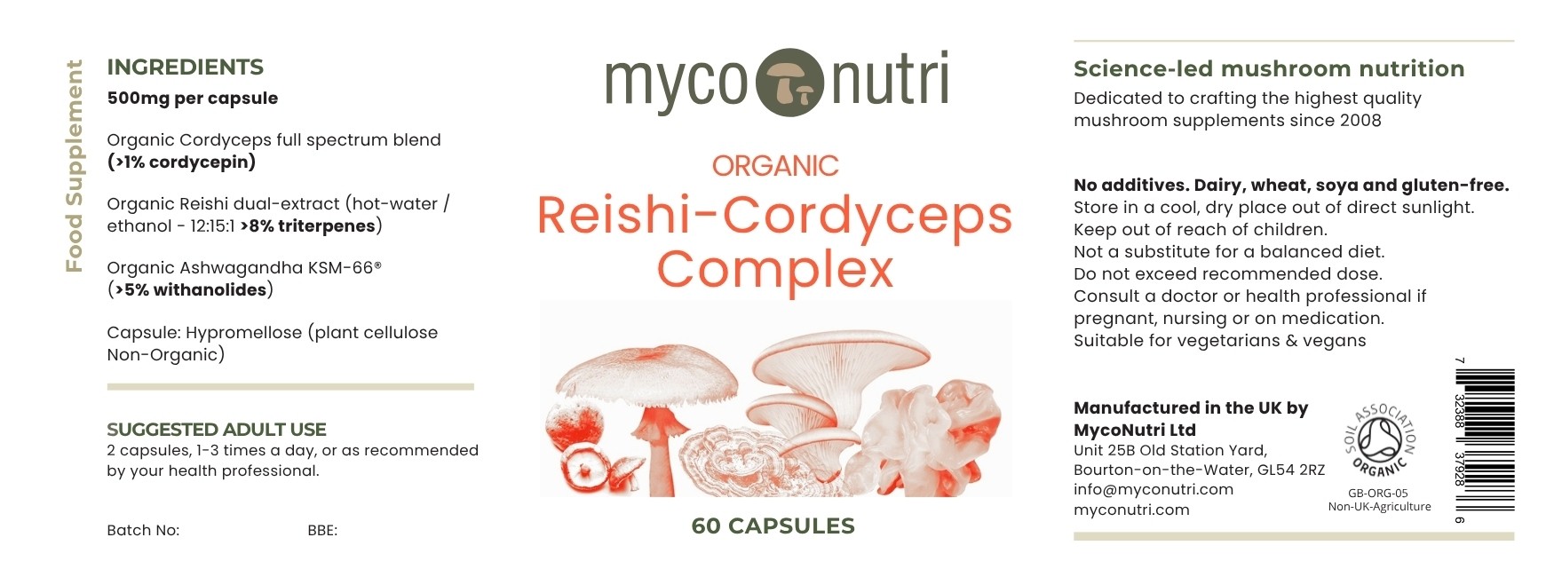 MycoNutri™ Reishi-Cordyceps Complex is formulated to support physical resilience, energy metabolism, and cognitive and adrenal function. It combines a full-spectrum Cordyceps blend (standardised to contain more than 1% cordycepin), Reishi (Ganoderma sichuanense) dual hot-water / ethanol extract, and Ashwagandha KSM-66.